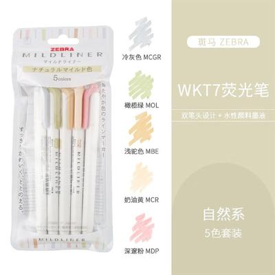 斑马荧光笔WKT7荧光色双头记号笔新色淡色系自然温和色标记笔划重点用手帐彩色笔 自然色5支套装+笔袋